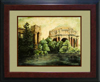 The frames are made of non-endangered hardwood; milled, assembled, finished & matted by the Artist in a small shop in Placerville, California. Planed boards are milled, mitered, splined with biscuits & glued. The frame is sanded, stained with red mahogany & two coats of sanding sealer are applied. Once again, the frame is sanded, followed by lacquer color coats; black on the edges; dark walnut on the face of the frame. It is finished with two coats of clear lacquer. The frame is then hand-rubbed with extra fine steel wool to achieve a satin finish. The prints are mounted behind clear glass framed by double acid-free mats. Acid free foam core & a dust cover complete the assembly. The back has a pocket applied to house the Certificate of Authenticity which comes with each print. A wire for hanging the frame is attached. Each frame is unique & because these frames are hand crafted from natural wood & are not a man made laminated veneer finish, there will be slight imperfections adding character to the whole piece. If imperfections will disturb you, perhaps you would prefer to purchase a print & have your local frame shop take it from there. In either case it is my sincerest hope that you will be satisfied.