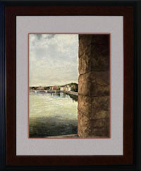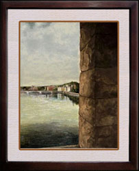 Florence is all about art; inside the buildings, the buildings themselves and the bridges used to reach the buildings. This painting is a view framed by one of the most famous bridges in Florence, the one known for its’ shops of fine jewelry. The artisan in me was taken by the stonework of the Ponte Vecchio.